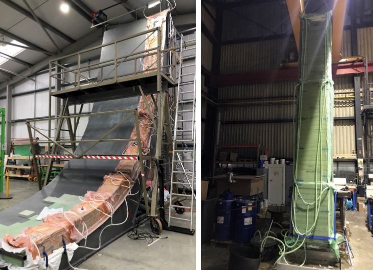 Damen Shipyard is developing a custom-made hull for an 80m offshore vessel (left) and thick and unique oblique layer laminates by Infracore (right). Image: CMT