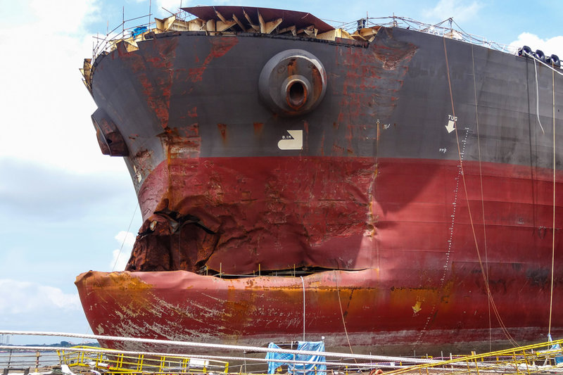 A tanker ship damaged in a collision in the congested waters of Singapore Strait.